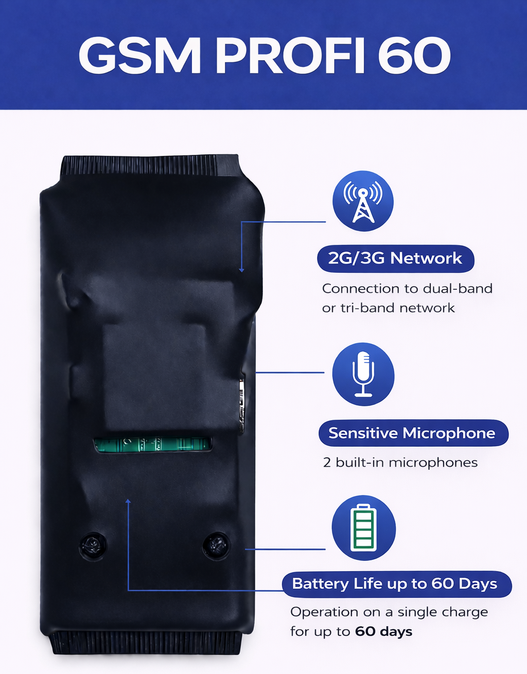 GSM spy bug with very clear sound and extremely long battery life of up to 60 days in noise detection mode. An exclusive GSM listening device that is hard to match by competitors. GSM PROFI 60 can operate for up to 60 days, even with voice detection activated. The GSM PROFI 60 is the result of our long-term testing and is manufactured directly in our own workshop. GSM PROFI 60 offers more than 3× longer battery life than any standard GSM listening device! It is especially suitable for long-term monitoring of spaces where connection to the electrical network is not possible. Unlike the PROFI 10+ models, the PROFI 60 still maintains very compact dimensions, making it very easy to conceal. It is a high-end compact device designed for listening and monitoring whether at home, in the office, in a warehouse, or anywhere with good GSM coverage. Simply insert a SIM card from any operator that has 2G/3G network coverage in your area (frequencies 850MHZ, 900MHZ, 1800MHZ, 1900MHZ), call the device, and you can listen to what is happening around the bug in real time. It is very important that the location where you intend to use the device has good GSM 2G/3G signal coverage. No detail will escape you, because PROFI will call you immediately once it detects any noise nearby. Whether someone is talking behind your back, cheating you, or planning a burglary, the GSM PROFI spy bug is ready to inform you instantly. Compared to its predecessors PROFI 10 / PROFI 20, GSM PROFI 60 is a top device on the market! It offers much longer battery life, a stronger battery, and at the same time very simple operation. GSM PROFI is an intelligent device that you definitely will not regret purchasing.